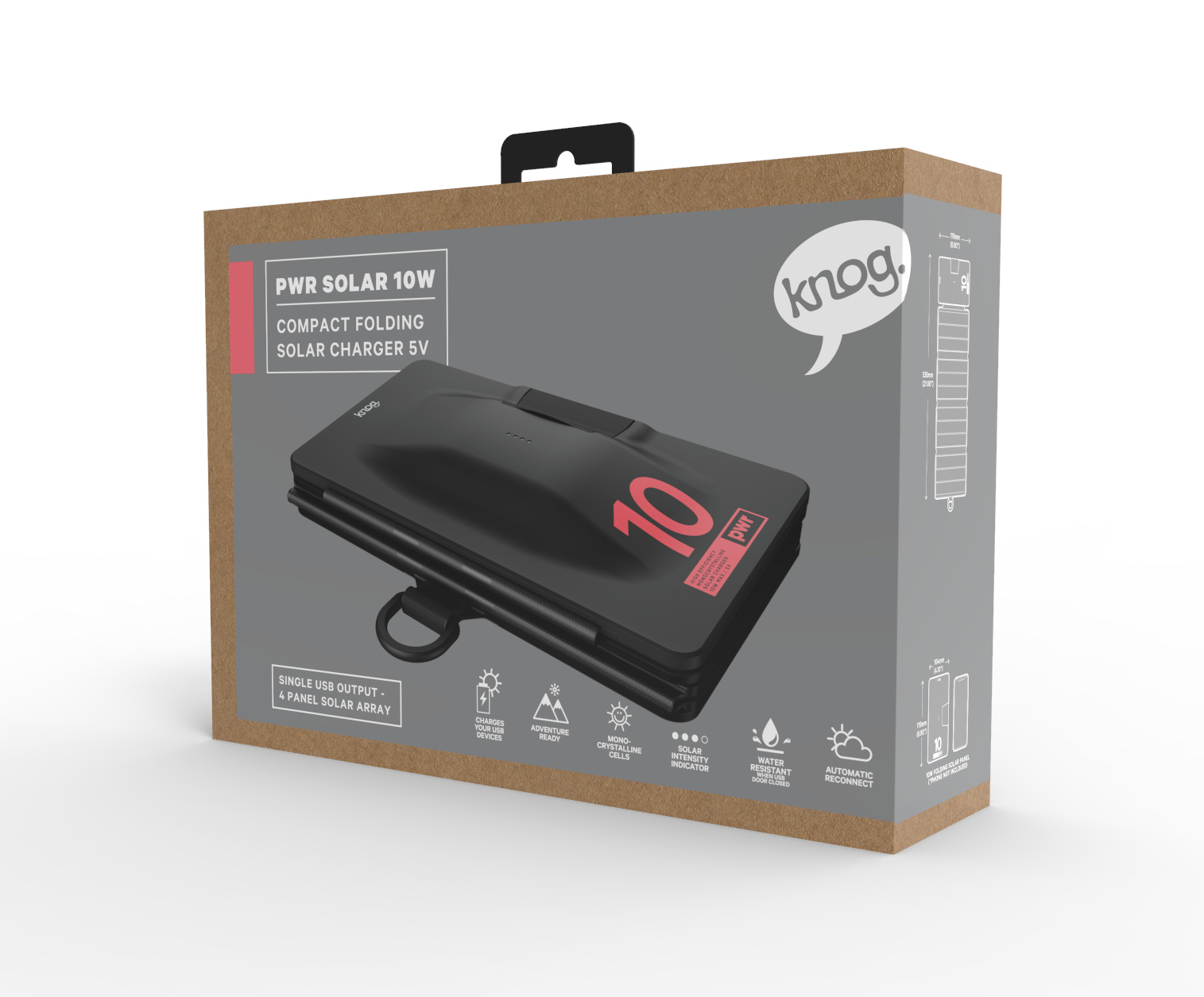 LEDs (Flashing) Displays the rate at which your device is charging (& will only deliver the required level of charge that a deviceSnap Magnet ClosureSmartly placed magnets allow for easy closure and storage of the Solar unit when not in use. These same magnets are also helpful when positioning the solar panel on a metal object.Power JunctionAccess your solar generated power using a standard USB connection. When not in use simply seal shut using the soft touch rubber access flap and your solar unit will be water resistant to a rating of IP65.Premium Solar CellsUtilising Sunpower Maxeon GEN 5 solar panels which feature Monocrystaline cells to allow for high module efficiency these are the same panels that NASA use.Intelligent Chip TechnologyAdvanced integrated chip technology allows the Knog solar panels to detect improving solar conditions, and automatically re-starts the charging process to allow the device to draw the optimal charging current in each circumstance.Sturdy D RingHandy D-Ring attachment allowing for convenient storage or premium placement for maximum sun absorption.Resistant EFTE CoatingOur Solar unit is coated using ETFE which is considered the leading industrial coating offering unparalleled protection from; heat, water, salt, oil, dirt and anything else the great outdoors can throw at you.Multi-Device ChargingIdeally suited to charge small, medium or large sized PWR Banks, as PWR banks are the stable way to charge any device. This powerful solar unit is also ideal for charging phones, smart watches, tablets or Go-Pros.Product Dimensions –